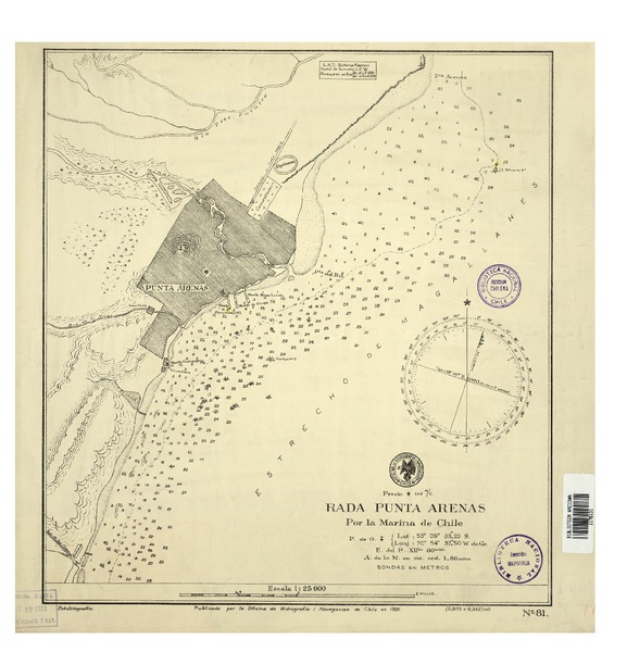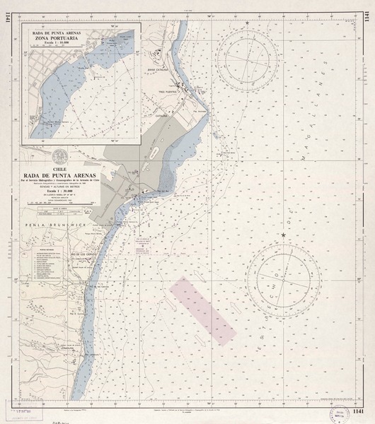 Rada de Punta Arenas y zonas portuarias [material cartográfico] por el Servicio Hidrográfico y Oceanográfico de la Armada de Chile.