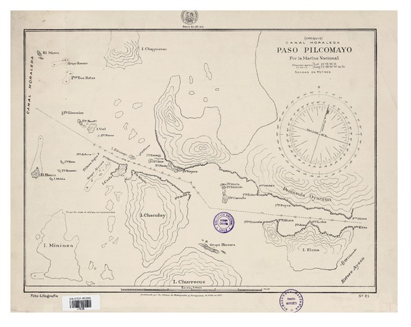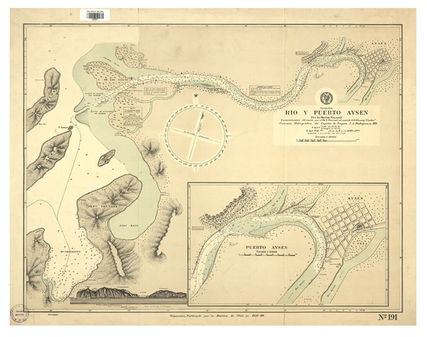 Río y Puerto Aysén [material cartográfico] por la Marina Nacional; levantamiento efectuado por el Tte. S. Barruel al mando de la Escamp."Cóndor"; Comisión Hidrográfica del Capitán de Fragata J. A. Rodríguez en 1930.
