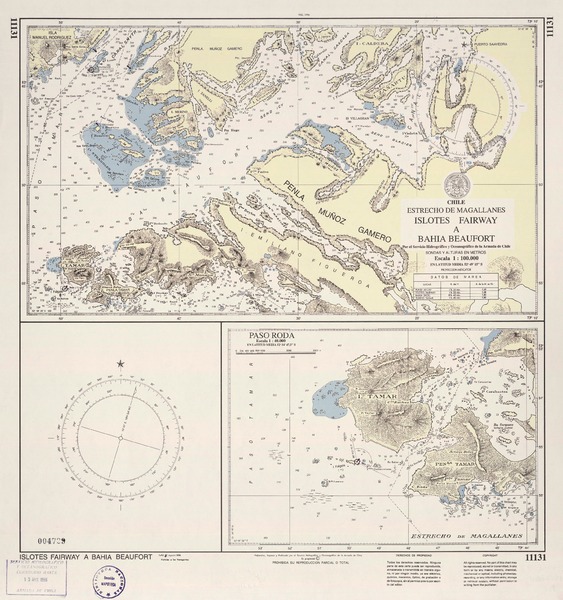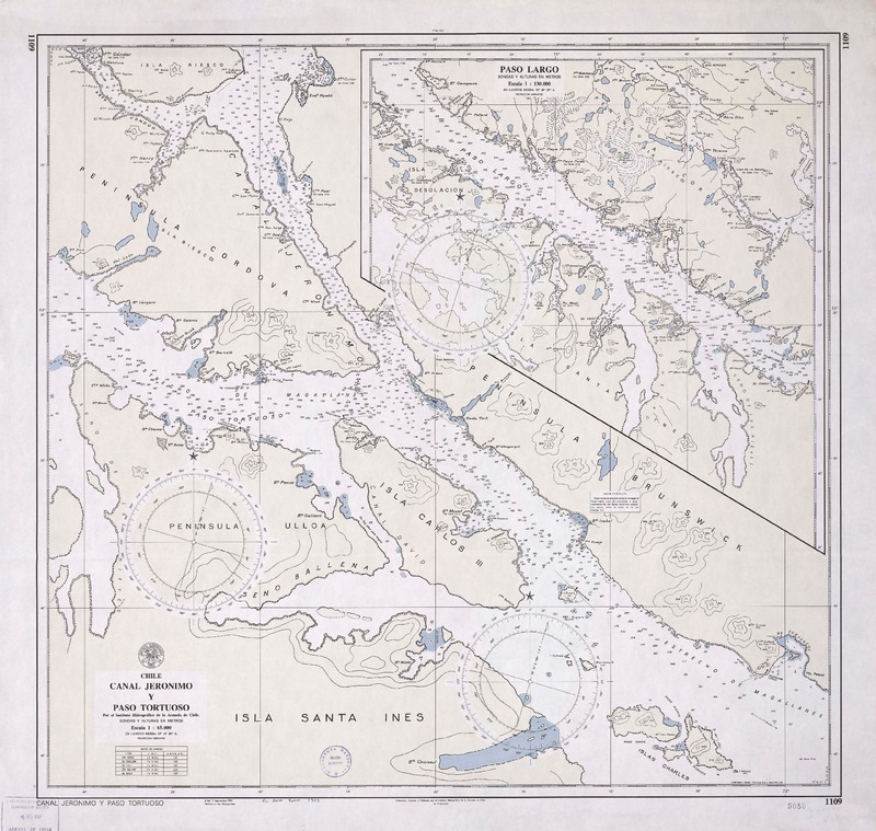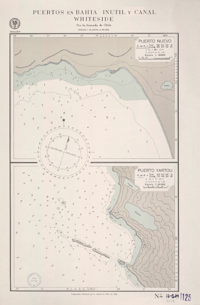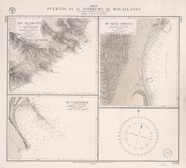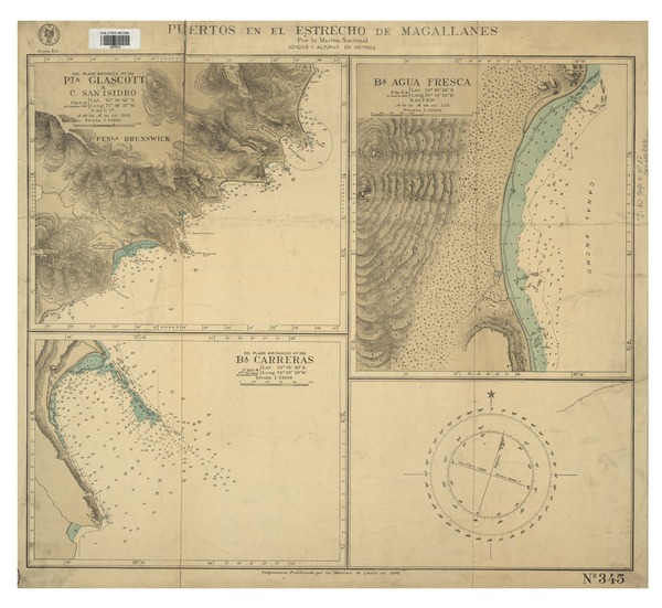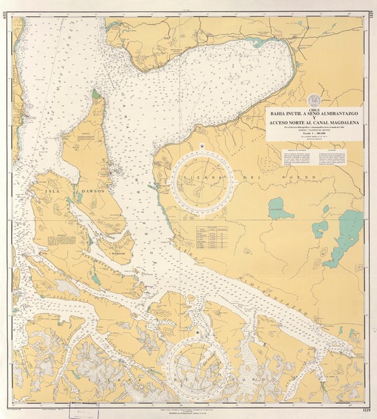 Bahía Inútil a seno Almirantazgo y acceso norte al canal Magdalena [material cartográfico] por el Servicio Hidrográfico y Oceanográfico de la Armada de Chile.