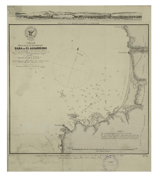 Rada de El Algarrobo provincia de Valparaíso [material cartográfico] : plano levantado por el Comte. del vapor Ancud, Cap. de Corb. Luis Pomar, los Tenes. 2os. Ramón Serrano M. i Roberto V. Cueto i el G. M. Alvaro Bianchi Tupper, en 1875.