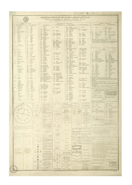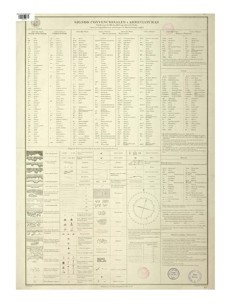 Signos convencionales i abreviaturas usados por la Oficina Hidrográfica de Chile i sus correspondientes usados por el Almirantazgo inglés [diagrama] : Oficina de Hidrografía y Navegación - Chile ; grabado por W.R. Thomson.