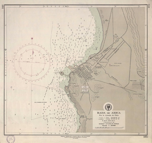 Rada y Puerto de Arica [material cartográfico] por el Servicio Hidrográfico y Oceanográfico de la Armada de Chile.