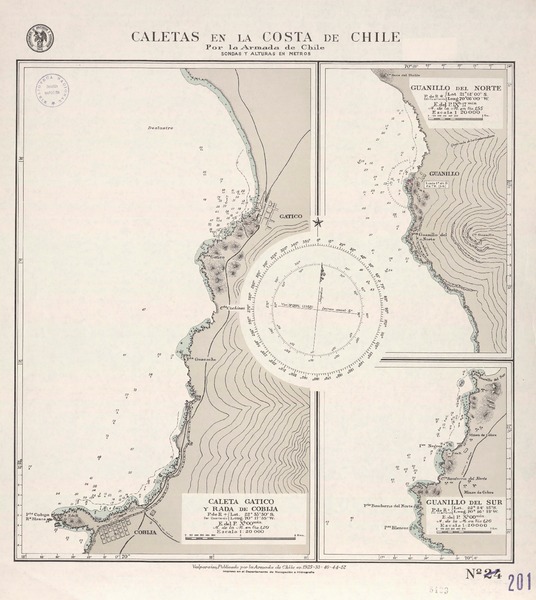 Bahía Guanaquero [material cartográfico] por el Servicio Hidrográfico y Oceanográfico de la Armada de Chile.