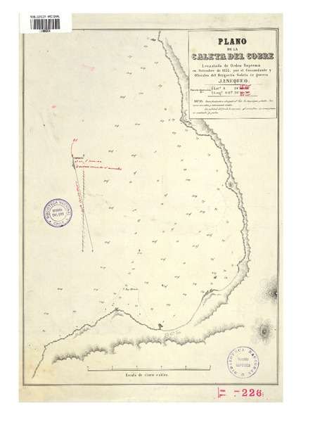 Rada Blanco Encalada provincia de Atacama [material cartográfico] : plano levantado en abril de 1877, de órden del Comandante del blindado "Blanco Encalada" Capitán de navío G. Señor Juan E. López, por el Tte. 2° Señor R. V. Cueto.