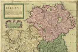 A New Map of Ireland divided into its provinces, counties and baronies, wherein are distinguished the Bishopricks, Borroughs, Barracks, Bogs, Passes, Bridges, &c. with the principal roads, and the common reputed miles [material cartográfico] / according to the newest and most exact observations by Herman Moll Geographer. [London] : Printed for H. Moll over against Devereux Court in ye Strand, I. Bowles at the Black Horse in Cornhill, P. Overton map & printseller near St. Dunftns Church Fleetstreet, and T. Bowles print & mapseller next to the chapter house in st. Pauls church yard. And by I King Map & Printseller at the Globe in the Poultry, 1714. 1 mapa : color, montado sobre tela ; 104 x 63 cm. .
