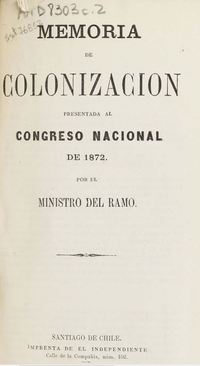 Memoria de Colonización : presentada al Congreso Nacional de 1872 / por el Ministro del Ramo. Santiago de Chile : Imprenta de El Independiente, 1872. xxii, 158 páginas [2] hojas de láminas plegables : diagramas ; 26 cm. .