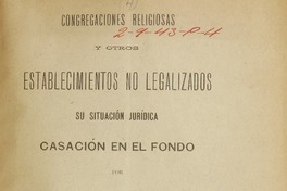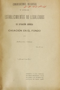 Congregaciones religiosas y otros establecimientos no legalizados : su situación jurídica, casación en el fondo / por Alberto Ojier. Santiago de Chile : Impr. i Casa Ed. de Ponce Hermanos, 1907. 55 p. ; 26 cm. .