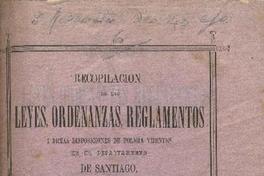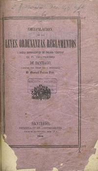 Recopilacion de las leyes, ordenanzas, reglamentos i demás disposiciones de policia vijentes en el departamento de Santiago, formada por órden del S. Intendente D. Manuel Valdes Vijil. Santiago : Impr. de "El Independiente", 1870. iii, 282 páginas ; 24 cm. .