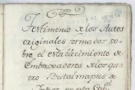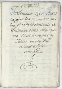 Testimonio de los autos originales formados sobre el establecimiento de los Embaxadores de los quatro Butalmapus de indios en esta cap[it]al de Sant[iag]o de Chile año de 1774 [manuscrito].