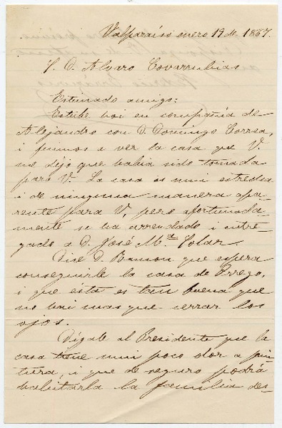 [Carta] Casa de Vd. JP. Enero 14 [1867] Sor. Dn Alvaro Covarrubias : [manuscrito] José Pardo.