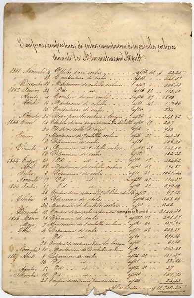 Compras i composturas de coches i mantención de caballos cocheros durante la administración Montt [Santiago de Chile] 1851 Octubre 1, [manuscrito].