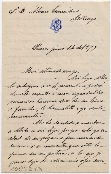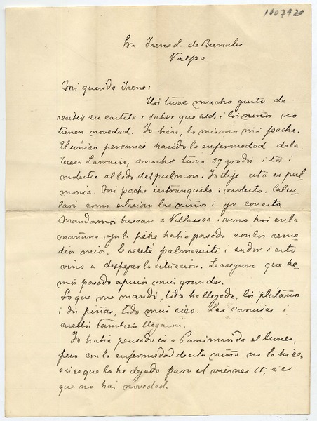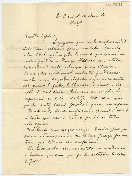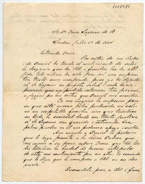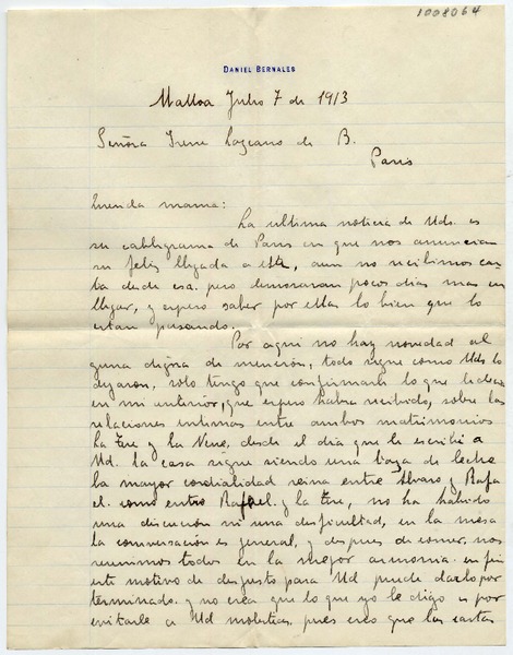Malloa [a] Señora Irene Lazcano de B. Paris [Carta], 1913 Julio 7, [manuscrito] Daniel Bernales Lazcano.