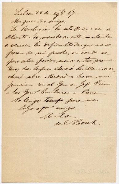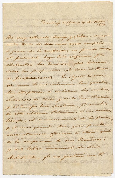 [Carta] 1822 oct[ubre] 19, Santiago de Chile [al] Sor Dn. Manuel Salas [manuscrito] Juan Diego Barnard.