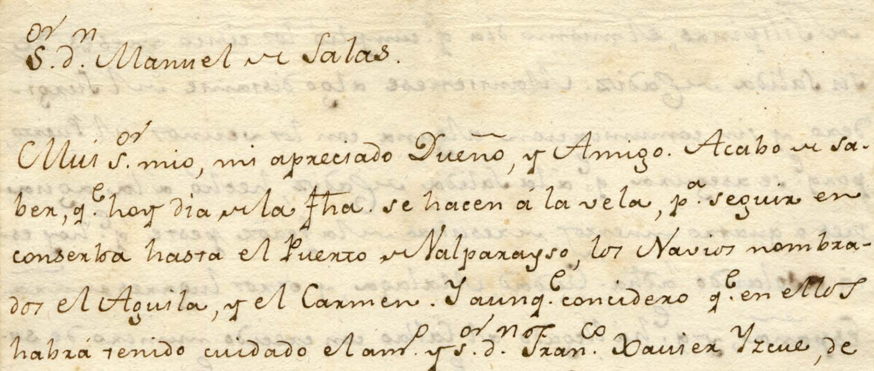 [Carta] 1805 Marzo 11, Lima [al] S. D. Manuel de Salas [manuscrito] El Marques de Zelada de la Fuente.