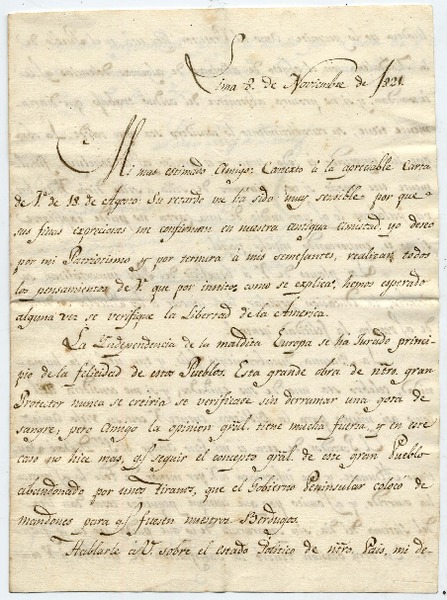[Carta] 1821 Noviembre 8, Lima [al] Sor D. Manuel de Salas [manuscrito] Be[rnard]o Josef de Zarate.