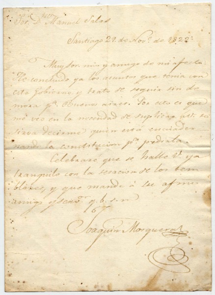 [Carta] 1822 Nov[iembre] 29, Santiago [al] Sor D. Manuel Salas [manuscrito] Joaquin Mosqueras.