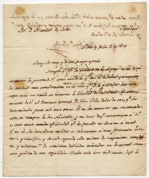 [Carta] 1829 Julio 12, Lima [al] Sor. D. Manuel de Salas [manuscrito] José Grego[rio] Paredes.