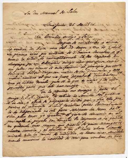 [Carta] 1826 junio 26, Lima [al] Sor. Don Manuel de Salas [manuscrito] Xaiv. de Luna Pizarro.