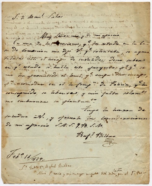 [Carta] 1829 Feb[rer]o 16, [Santiago?] [al] S. D. Man[uel] Salas [manuscrito] Rafael Bilbao.