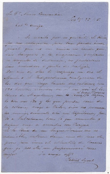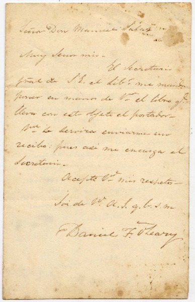 [Carta] 1821 Setiembre 8, San[tiago] [al] Señor Don Manuel Salas [manuscrito] Daniel F. O'Leary.
