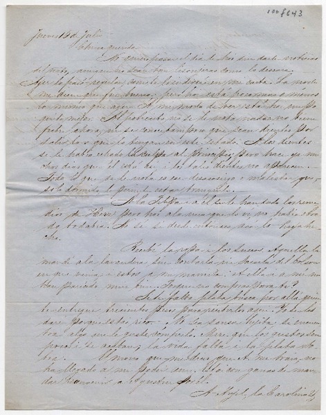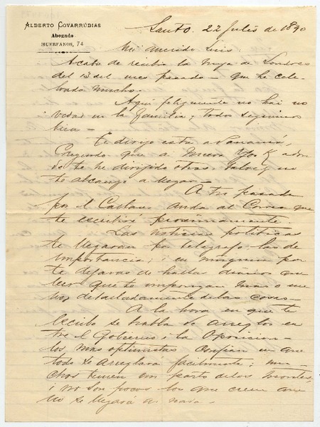 [Carta de Don Alvaro Covarrubias a Doña] 1852 Julio Domingo 4, [Santiago?] Sra. Da. Benigna Ortúzar de Covarrubias [manuscrito] Álvaro.