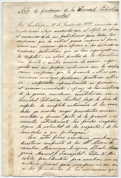 Acta de fundacion de la Sociedad Patriótica Central [manuscrito].