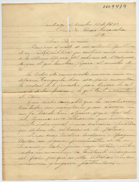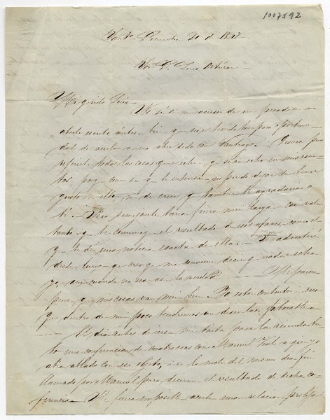 [Carta] 1847 Diciembre 20, Santiago [a] Luis Ortúzar [manuscrito] Alvaro [Covarrubias].