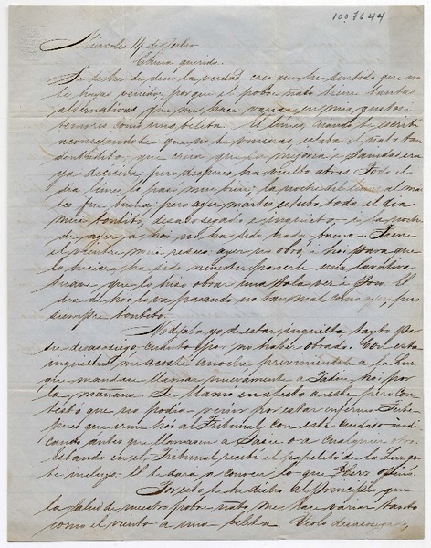Carta de Don Alvaro Covarrubias a Doña Benigna Ortúzar : 19 de julio <1852> [manuscrito]