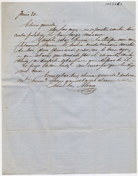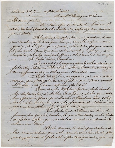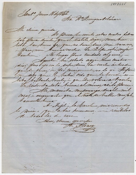 [Carta] 1852 Junio 16, Sant[iag]o Sra. Da. Benigna Ortúzar [manuscrito] Álvaro.