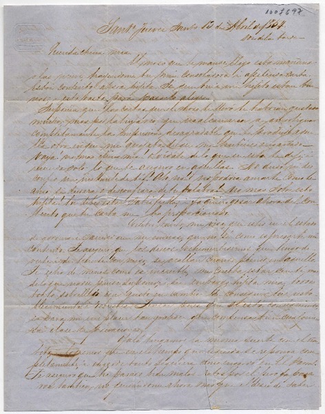 [Carta] 1848 Abril 1, Santiago [a] Benigna Ortúzar [manuscrito] Alvaro [Covarrubias].