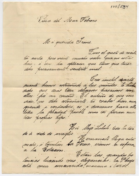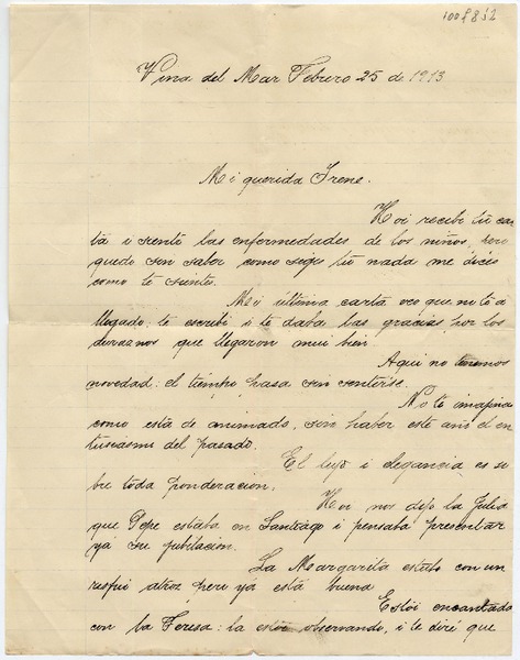 [Carta] 1913 Febrero 25, Viña del Mar [para Doña Irene Lazcano Echaurren] [manuscrito] Maria Teresa.