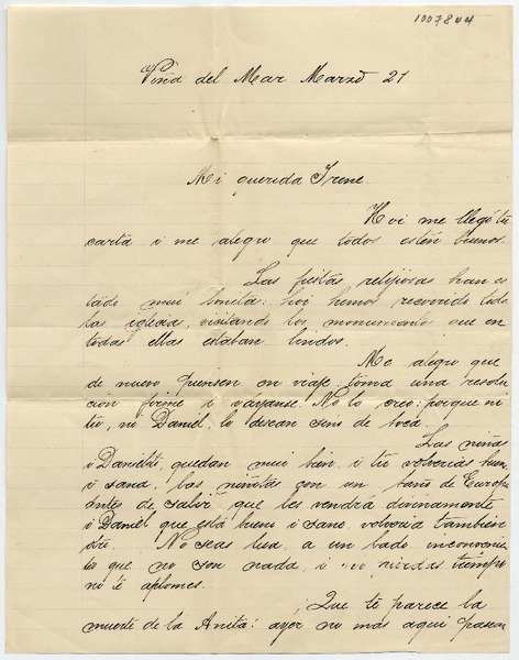 [Carta] [1913?] Marzo 21, Viña del Mar [para Doña Irene Lazcano Echaurren] [manuscrito] Maria Teresa.