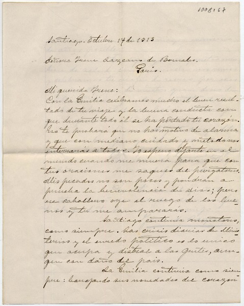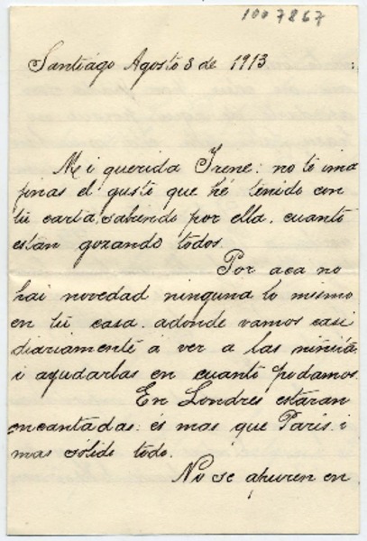 [Carta] 1913 Agosto 8, Santiago [para Doña Irene Lazcano Echaurren] [manuscrito] Maria Teresa.