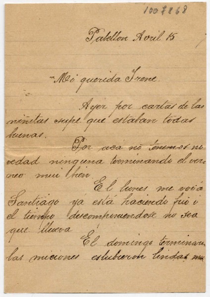 [Carta] [1913?] Abril 15, Pabellon [Santiago] [para Doña Irene Lazcano Echaurren] [manuscrito] Maria Teresa.