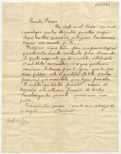 [Carta] 1896 Octubre 14, Sant[iag]o Mi Doña Irene L. de Bernales [manuscrito] Daniel.