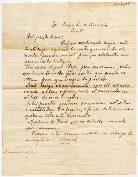 [Carta] [18]95 Diciembre 2, [Malloa?] Par[a] Irene L. de Bernales Sant[iag]o [manuscrito] Daniel.
