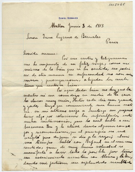 [Carta] 1913 Junio 8, Malloa Señora Irene Lazcano de Bernales Paris [manuscrito] Daniel Bernales Lazcano.