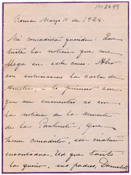 [Carta] 1924 Marzo 11, Roma Señora Irene Lazcano de Bernales [manuscrito] Julia.
