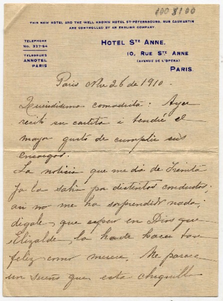 [Carta] 1910 Ma[rzo] 26, Paris Queridisima comadrita [manuscrito] Julia.