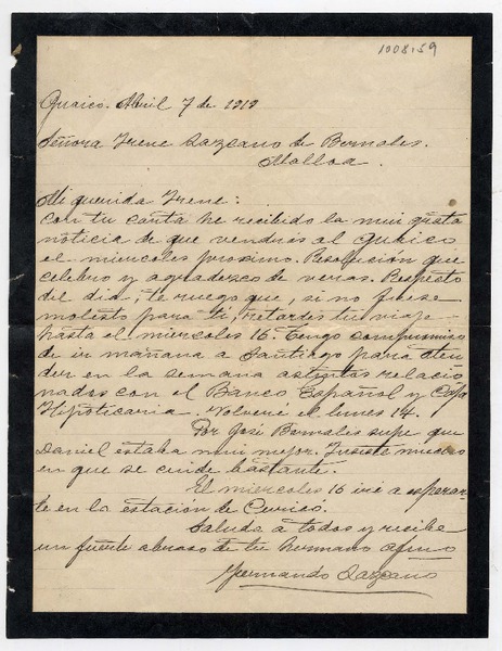 [Carta] 1919 Abril 7, Guaico [a] Señora Irene Lazcano de Bernales [manuscrito] Fernando Lazcano