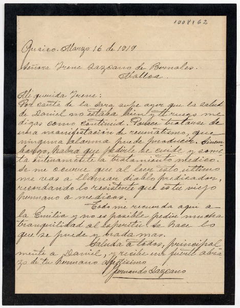 [Carta] 1919 marzo 16, Guaico [a] Señora Irene Lazcano de Bernales [manuscrito] Fernando Lazcano.