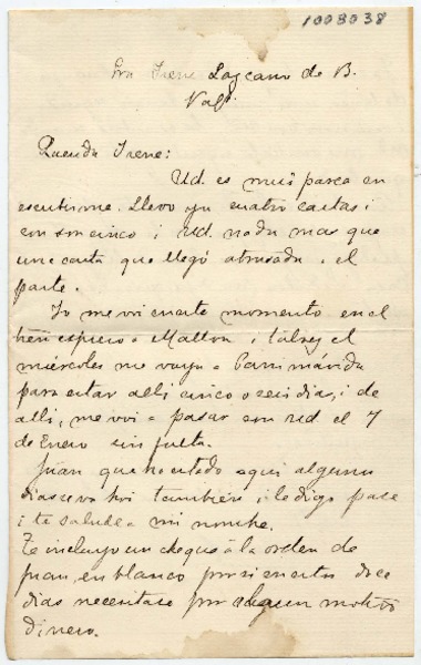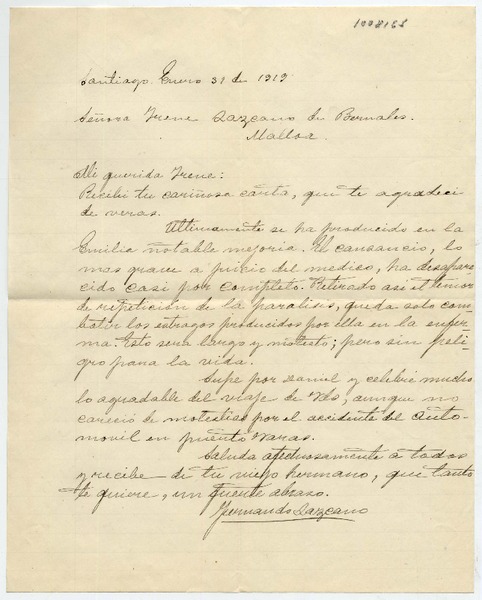 [Carta] 1919 Enero 31, Santiago [a] Señora Irene Lazcano de Bernales [manuscrito] Fernando Lazcano.