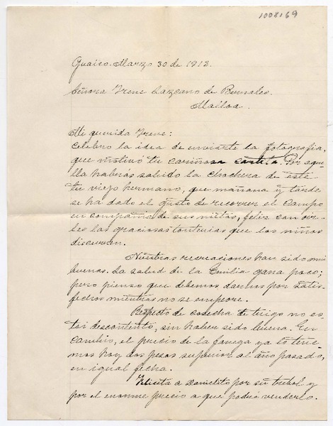 [Carta] 1913 marzo 30, Guaico [a] Señora Irene Lazcano de Bernales [manuscrito] Fernando Lazcano.