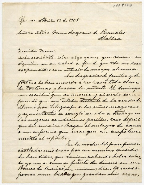 [Carta] 1905 abril 19, Guaico [a] Señora Doña Irene Lazcano de Bernales [manuscrito] Fernando Lazcano.