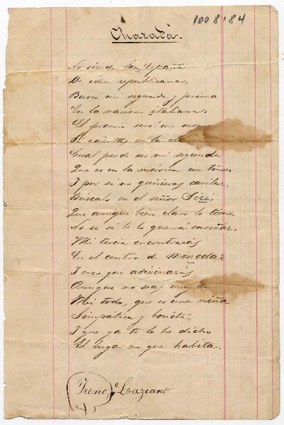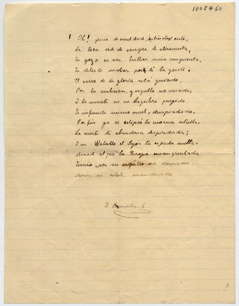 [Poema] ¡Oh! genio de crueldad, destructor ente [manuscrito] D. Bernales.