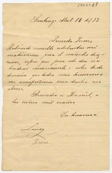 [Carta 19]13 Abril 13, Santiago [a] Irene [Lazcano de Bernales] [manuscrito] Luisa Lazcano.