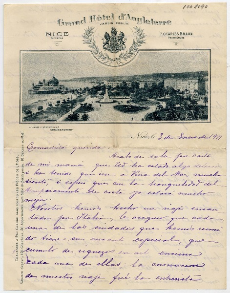 [Carta] 1911 enero 3, Niza [a Irene Lazcano Echaurren] [manuscrito] Julia Saavedra Rivera.