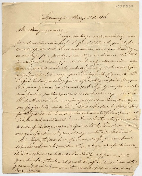 [Carta] 1848 Marzo 17, Santiago [a] Benigna Ortúzar [manuscrito] Alvaro [Covarrubias].