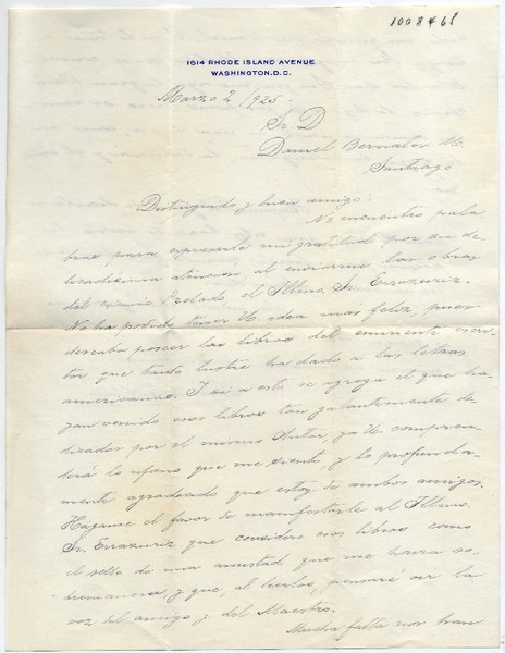 [Carta] 1925 Marzo 2, Washington [a] Daniel Bernales Mancheño : 2 de marzo 1925 [manuscrito] Alfonso Robledo.