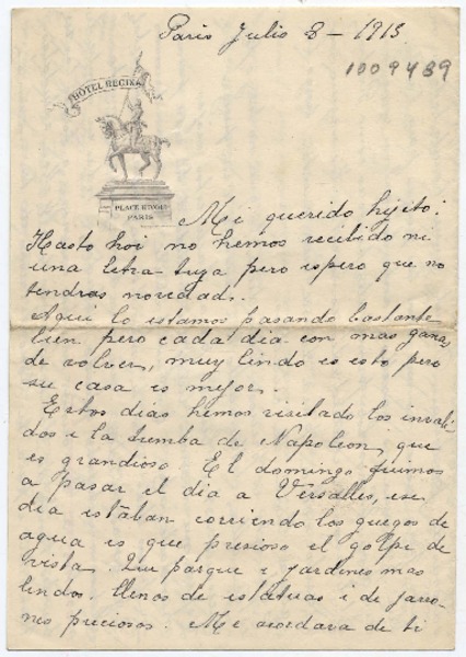[Carta] 1915 Julio 8, Paris [a] Mi querido hijito [manuscrito] [Irene Lazcano Echaurren].
